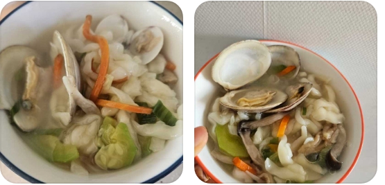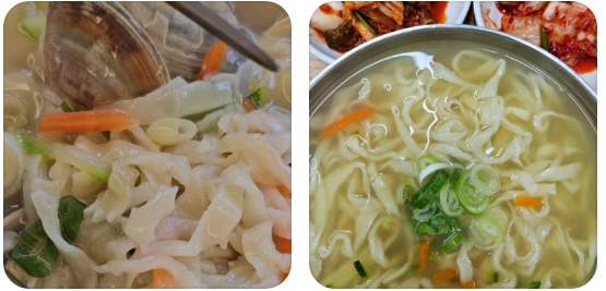 • 맑고 시원한 멸치 육수: 칼국수 국물은 각종 해산물과 채소를 넣고 푹 우려낸 맑고 시원한 멸치 육수입니다. 깔끔하고 개운한 맛이 손칼국수 면발에 스며들어 구수하면서도 깊은 감칠맛을 냅니다.
