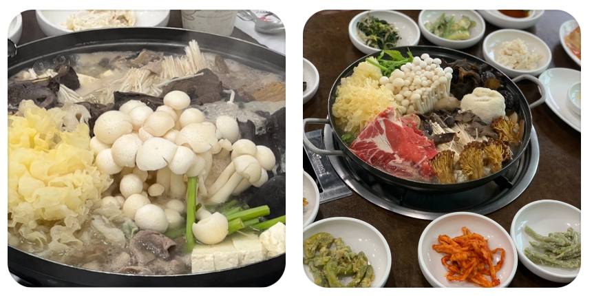 - 다양한 종류의 버섯: 새송이, 느타리, 팽이 등 기본적인 버섯 외에도 능이버섯, 노루궁뎅이버섯 등 귀한 약용 버섯까지 아낌없이 사용됩니다. 여러 종류의 버섯이 끓여지면서 내는 깊고 복합적인 풍미가 전골의 맛을 풍성하게 만듭니다.