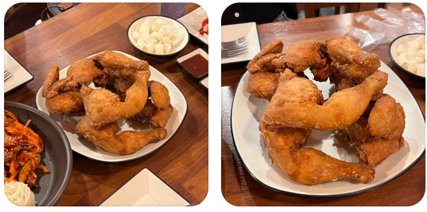 - 촉촉한 속살: 겉은 바삭하고 속은 육즙으로 가득 찬 촉촉함을 유지하여, '겉바속촉'의 정석을 보여줍니다. 뜨거운 기름 속에서 닭의 수분을 가두는 완벽한 튀김 기술이 적용된 결과입니다.