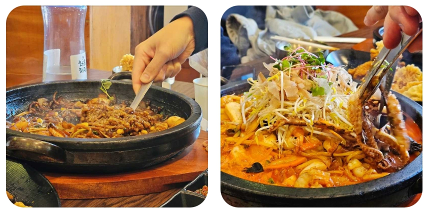 특히 낙지돌짜장에 들어가는 낙지는 그 존재감부터가 압도적입니다. 신선한 낙지를 통째로 사용하며, 돌판의 잔열로 인해 낙지의 단백질이 오버쿠킹 되지 않도록 적절한 타이밍에 조리하는 것이 핵심 기술입니다. 낙지 특유의 쫄깃하면서도 부드러운 식감은 춘장의 짭조름하고 고소한 맛과 어우러져 해물 짜장의 정점을 보여줍니다. 또한, 고기돌짜장의 경우 엄선된 육류를 넉넉히 사용하여 기름진 고소함을 배가시켰습니다. 고기에서 배어 나온 육즙이 짜장 소스와 결합하여 입안 가득 묵직한 바디감을 선사하는데, 이는 일반적인 짜장면에서는 느끼기 힘든 고급스러운 풍미입니다. 면발 역시 돌판 위에서 쉽게 퍼지지 않도록 배합된 수타 방식의 질감을 유지하고 있어, 소스가 면 사이사이 깊숙이 배어들어도 탄력 있는 식감을 오랫동안 즐길 수 있습니다.