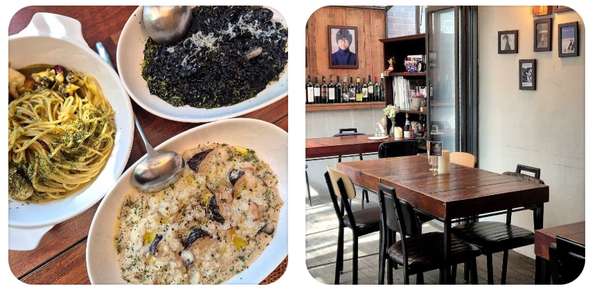 오징어 먹물 파스타 역시 빼놓을 수 없는 걸작입니다. 면 자체가 먹물을 머금어 검은 빛을 띠는 경우도 있지만, 이곳에서는 진한 먹물 소스를 베이스로 하여 면과 소스의 일체감을 극대화합니다. 파스타 면의 굴곡 사이사이에 촘촘하게 박힌 먹물 소스는 혀끝에 닿는 순간 즉각적인 감칠맛을 전달합니다. 특히 마늘과 페페론치노를 활용해 자칫 무거울 수 있는 먹물의 맛에 경쾌한 타격감을 더한 것이 특징입니다. 서양의 파스타가 동양의 식재료인 오징어와 만나 국경을 초월한 미식의 화합을 이루는 장면입니다. 이러한 디테일한 조리법은 식재료에 대한 깊은 이해 없이는 불가능한 영역이며, 이것이 바로 많은 이들이 이 골목 끝 식당을 찾는 이유입니다.