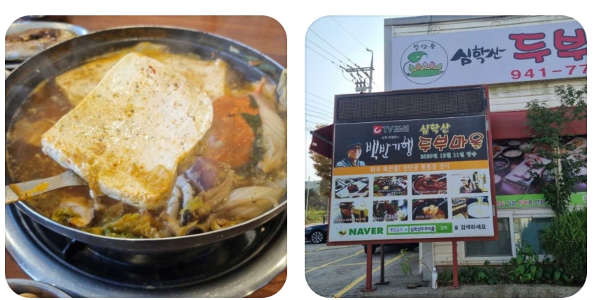 KBS [2TV 생생정보 2433회] <음식 X-파일>을 통해 소개된 [심학산두부마을]은 파주의 명물 장단콩과 선조들의 전통 방식을 고집하여 두부 요리의 진수를 보여주는 곳입니다. 정성껏 만든 손두부의 고소하고 담백한 맛은 콩이라는 귀한 식재료가 가진 놀라운 영양과 가치를 다시 한번 깨닫게 합니다. 두부 한 모에 담긴 한국인의 정성과 지혜를 [심학산두부마을]에서 느껴보시길 바랍니다.