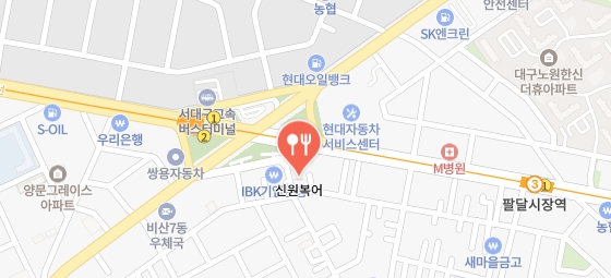 대구 신원복어는 만평네거리 근처에 자리 잡아 대중교통 이용이 편리한데, 만평역 2번 출구에서 도보로 약 4~5분이면 도착합니다. 매장 앞에 소수 주차 공간이 있으나, 피크 시간대에는 사용이 어려워 인근 공영주차장 이용을 추천드립니다.