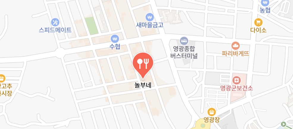 놀부네는 전라남도 영광읍 중심가에 위치해 접근성이 아주 좋은 식당입니다. 영광읍 시외버스터미널에서 도보로 약 7분 정도 걸려 대중교통을 이용해도 편리하게 방문할 수 있습니다.