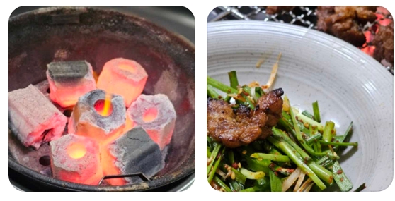 • 참숯의 강력한 불향: 고기를 굽는 데 사용하는 참숯은 강력한 화력을 제공하며, 고기에 그윽한 숯불 향을 입히는 핵심 요소입니다. 고기 표면을 빠르게 익혀 육즙 손실을 최소화하고, 고추장 양념이 타지 않도록 은은하면서도 강력한 불맛을 입힙니다.